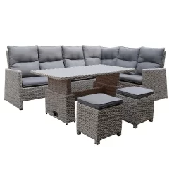 Perfect for entertaining guests outdoors on warm sunny days, this contemporary Matara rattan effect garden corner sofa set will add a modern feel to any garden or patio. Comprising of sofa, L-shaped sofa, table, two cushioned footstools and both seat and back cushions, this versatile dining set can be quickly transformed from a dining set into a lounge set. Ideal for both indoor and outdoor use, this stylish dining set is constructed with powder-coated steel frame and hand woven synthetic rattan.