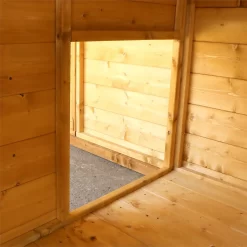 The walls, floor and roof are made using interlocking tongue and groove cladding; this creates a solid structure that is guaranteed to offer many years of reliable service. Two doors feature in this dog kennel, one that enters the sheltered area and one that enters the open faced section. A small doorway connects the sheltered area and run itself so your dog is never restricted. The mesh used in the front of the panel is galvanised, this increases the longevity of the building.