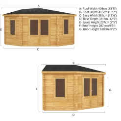 The Mercia 4m x 4m Corner Log Cabin boasts a stylish, spacious and contemporary corner design complimented by traditional features. With two large windows and half glazed double doors, the extensive interior space is light, airy and welcoming. This clever shape is designed to help maximise the area you have available and fit perfectly into the corners of your outdoor space, while giving you panoramic views of your garden.